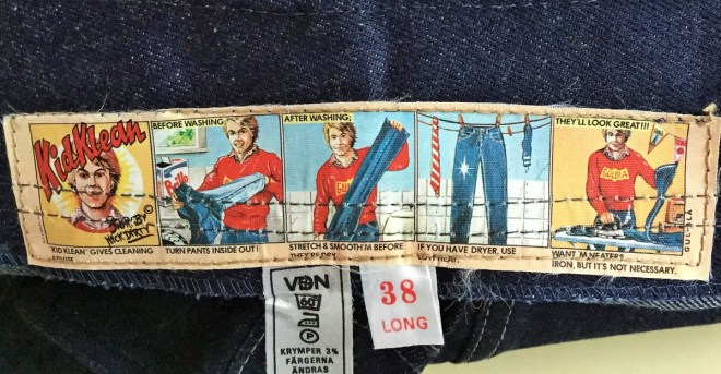 De trevligaste tvättråden jag sett. Tänk dig jeans man kan tvätta i sextio grader och som inte kryper mer än 5 % ändå! Man får väl trösta sig med att dagens tvättråd är miljövänligare. Bilden är från gulblå-story.se.